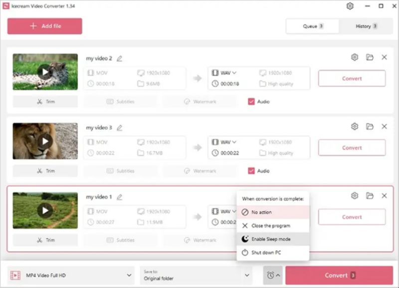 ICECREAM视频转换器是一种多功能的多媒体转换软件,允许用户在各种格式之间转换视频和音频文件。除其他功能外,它有一个MP4到WVV转换器选项。
