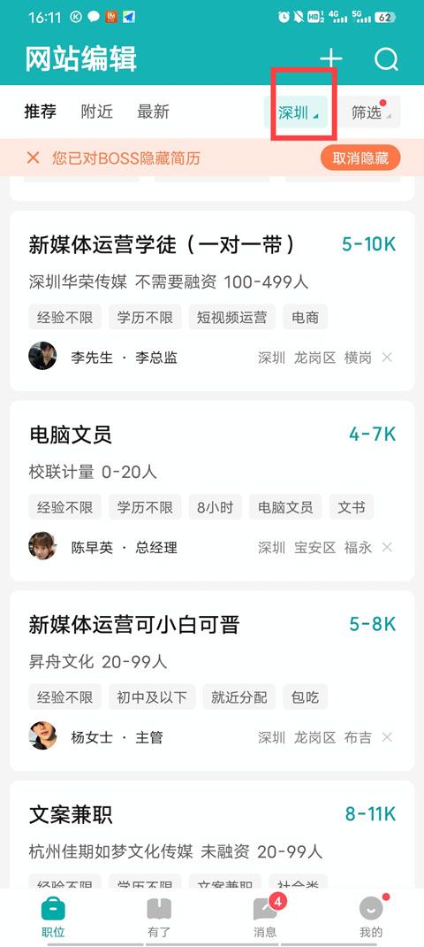 1、进入BOSS直聘app首页,点击深圳位置。