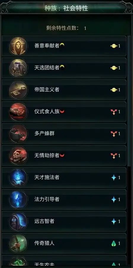 · 天才施法者(gifted casters):【效果】+20世界施法点、+20战斗施法点;【初始奖励】额外解锁1项战斗法术;【冲突】远古智者(ancient wise ones)、暗影行者(shadow walker)| 旧版名称-阴险守望者(devious watchers)。