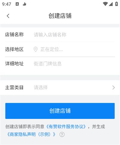 5、输入"店铺名称",选择"地区"和"详细地址",选择"主营类目";确认信息无误后,点击"创建店铺",即完成新店铺的创建。